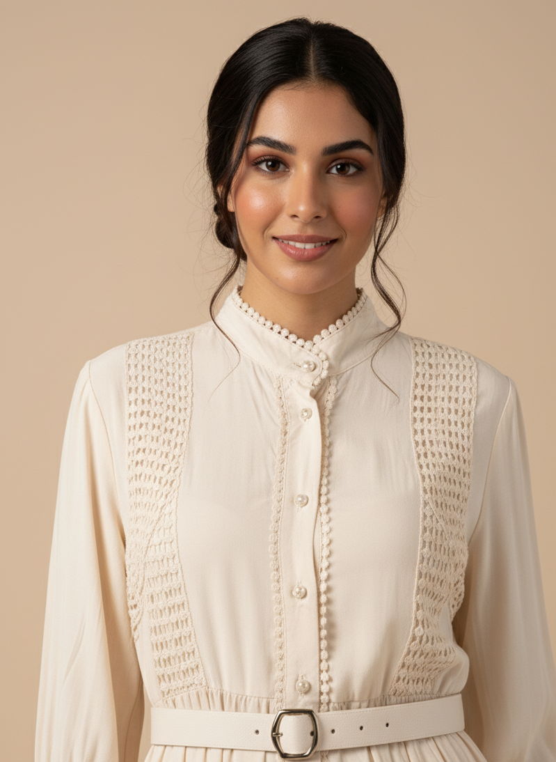 - Elegant sleeves with lace details for a sophisticated and feminine touch.