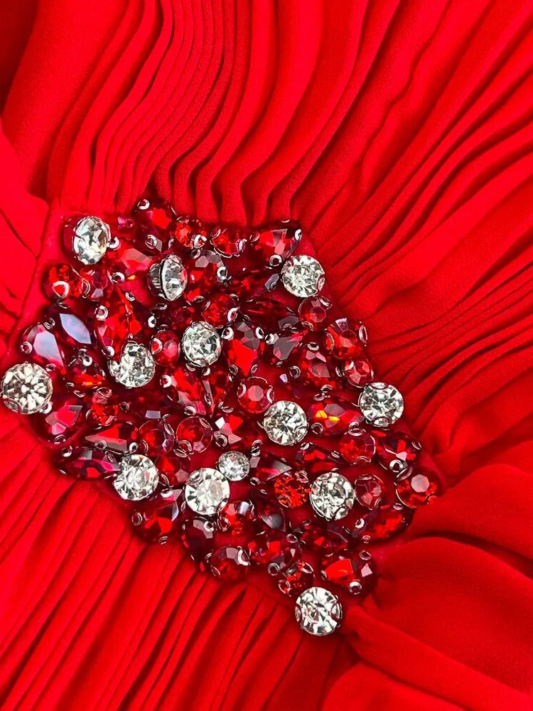 - Beautiful pleated details with stone embellishments.